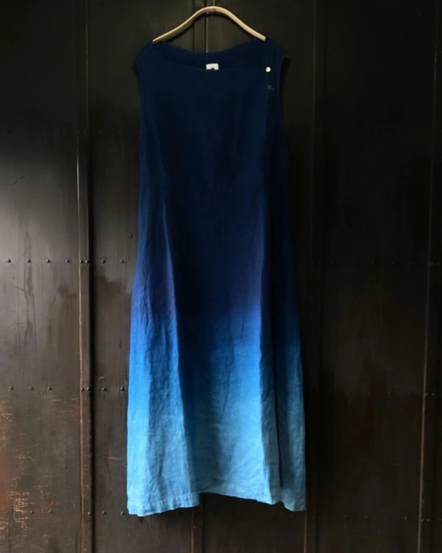 萌蘖の藍染は、滋賀にある明治から正藍染の技を代々受け継いでいる紺屋にて、麻、綿、カディコットンなどを主に一枚一枚手染めされています。